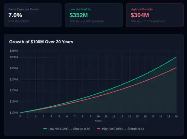 Danh mục đầu tư có độ biến động thấp cuối cùng đã thu về thêm 48 triệu đô la, tương ứng với mức tăng trưởng tài sản 16%, mặc dù có cùng "lợi nhuận kỳ vọng". Đây không phải là vấn đề về sở thích rủi ro, mà là một thực tế toán học: sự biến động làm giảm giá trị tài sản theo thời gian.